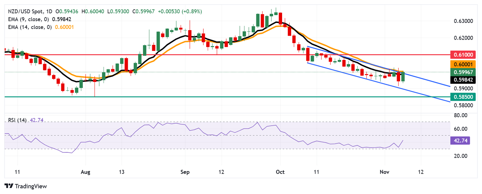 The NZD/USD pair has recovered its recent losses from the previous session, trading around 0.5990 during the European hours on Thursday. Daily chart analysis indicates a weakening bearish bias, with the pair breaking above the nine-day Exponential Moving Average (EMA), aligned with the upper boundary of the descending channel.