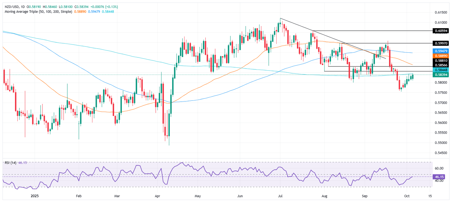 - Kiwi buyers target a close above the 200-day SMA at 0.5848 to trigger a bullish extension.