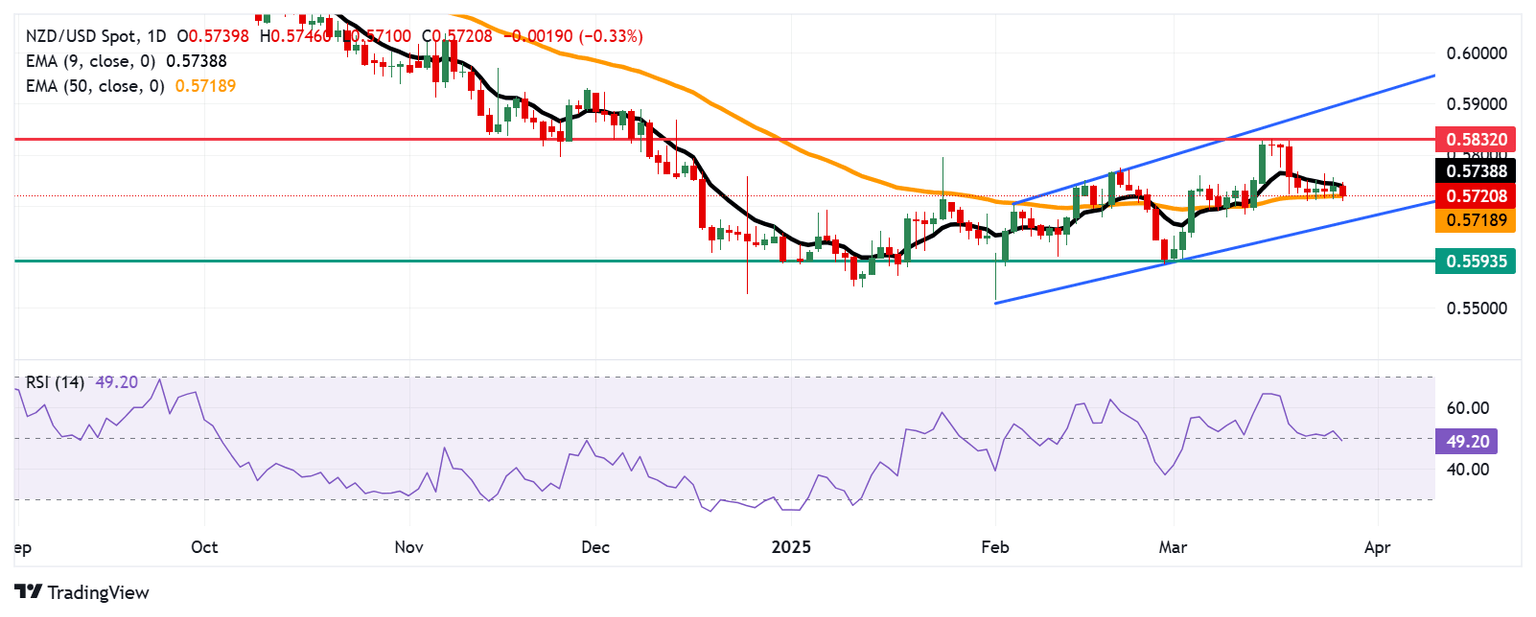 A break below the 50-day EMA at 0.5718 could weaken medium-term momentum, intensifying downside pressure on the NZD/USD pair. This could lead to a test of the psychological support at 0.5700, with the lower boundary of the ascending channel near 0.5670 as the next key level. A breakdown below this channel would reinforce the bearish bias, potentially driving the pair toward the monthly low of 0.5593, recorded on March 3.