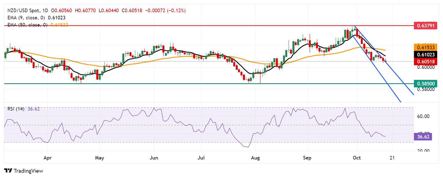 The NZD/USD continues its losing streak for the fourth consecutive day, hovering around 0.6050 during Thursday's European trading session. The analysis of the daily chart shows that the pair attempts to remain within the descending channel pattern, signaling a continuation of the bearish trend.