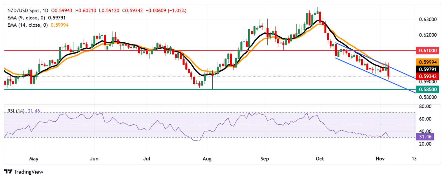 NZD/USD Price Forecast: Falls toward descending channel's lower boundary near 0.5900