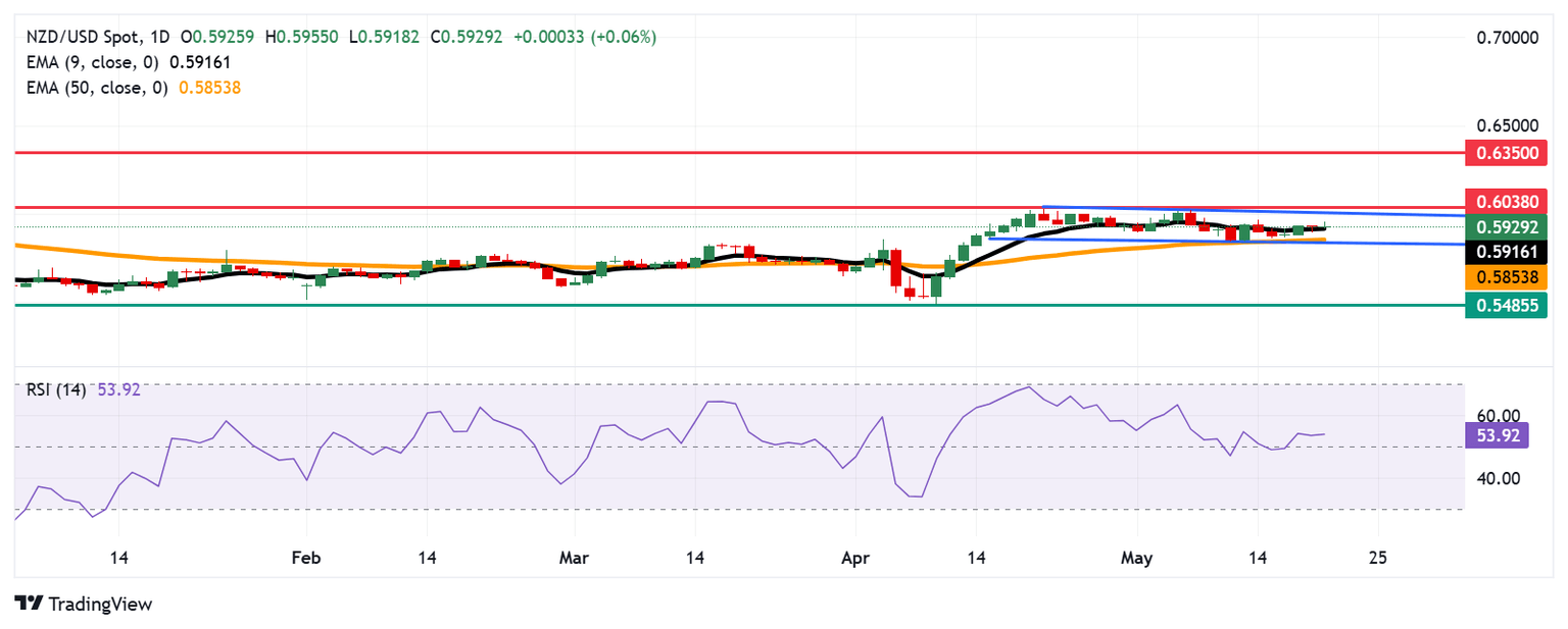 A bullish bias is expected to be reinforced as the 14-day Relative Strength Index (RSI) remains slightly above the 50 mark. Meanwhile, the NZD/USD pair is positioned above the nine-day Exponential Moving Average (EMA), indicating a short-term price momentum is stronger.