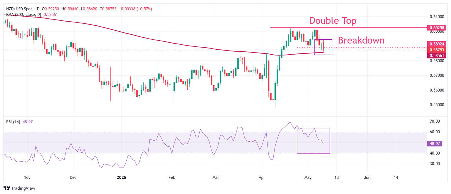 NZD/USD slides to near 0.5870 on a breakdown of the Double Bottom formation on a daily timeframe after breaking below the last higher low of 0.5890. The pair has fallen to near the 200-day Exponential Moving Average (EMA), which trades around 0.5860. The overall trend will turn bearish if the asset slides below the 200-day EMA.