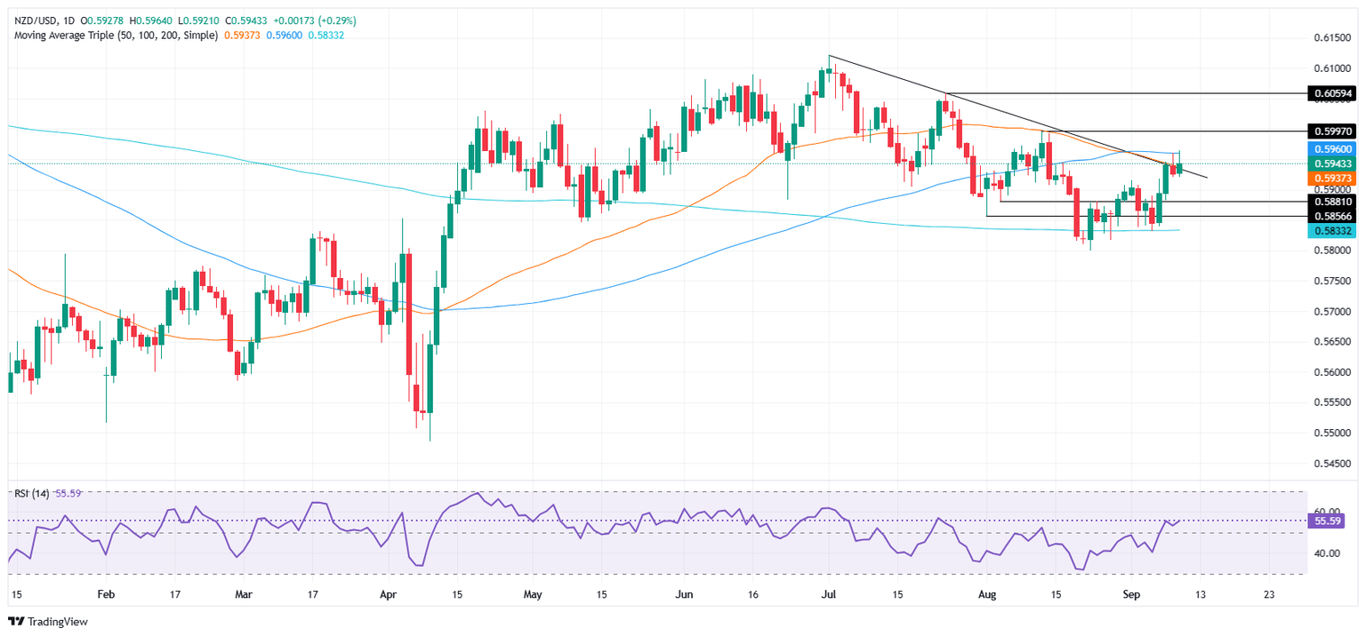 If NZD/USD climbs past the 100-day SMA, the next resistance will be the August 13 peak at 0.5996, followed by the July 24 cycle high at 0.5059. On the other hand, if the pair slides below 0.5900, the first support would be the 20-day SMA at 0.5886, ahead of the 200-day SMA at 0.5836.