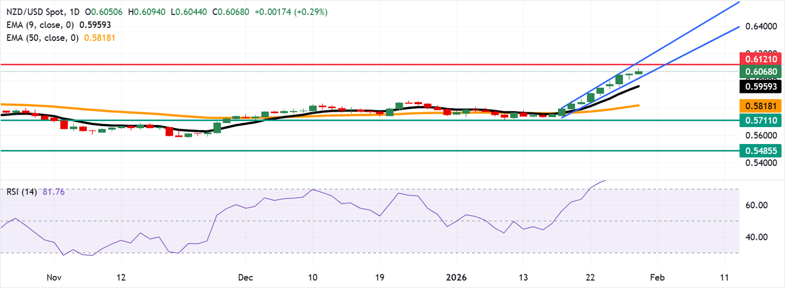 NZD/USD continues its winning streak that began on January 16, trading around 0.6080 during the European hours on Thursday. The technical analysis of the daily chart signals a persistent bullish bias as the pair price rises within the ascending channel pattern.