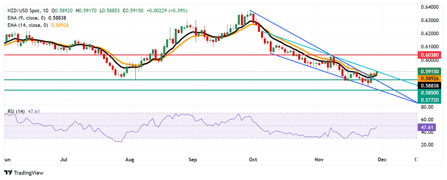 NZD/USD Price Forecast: Tests descending channel’s upper boundary above 14-day EMA, 0.5900