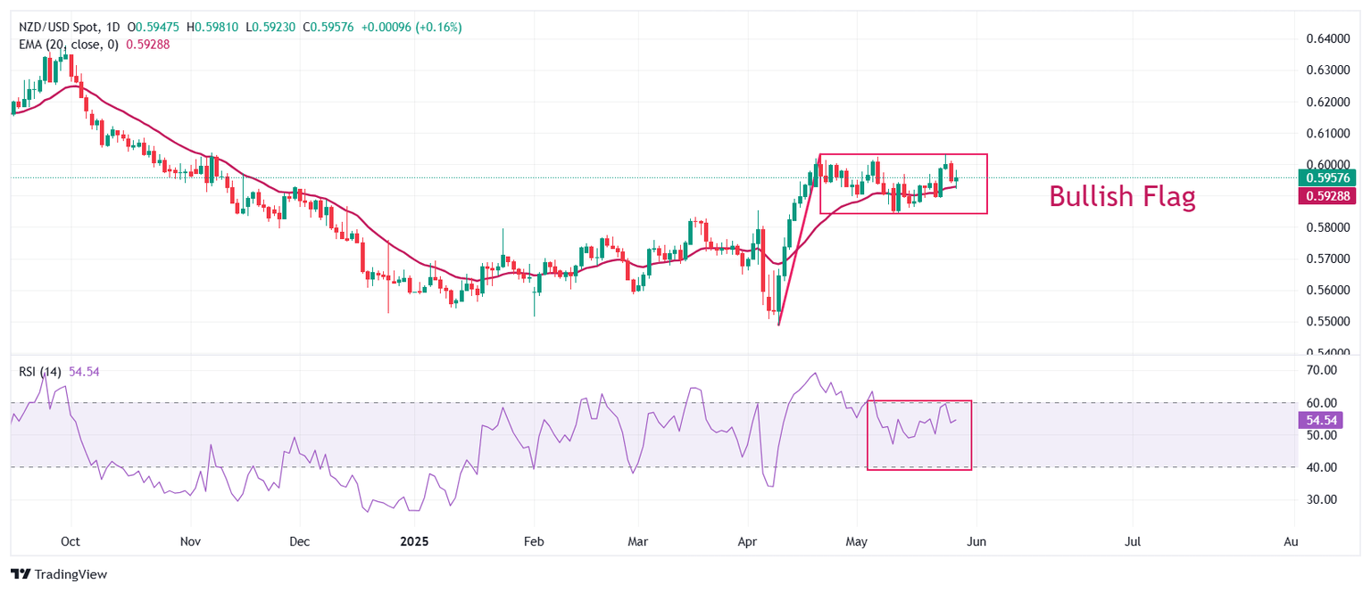 NZD/USD strives to break the Bullish Flag formation on the upside. Historically, the chart pattern resumes its strong rally after a breakout of the consolidation. The near-term trend of the pair is bullish as the 20-day Exponential Moving Average (EMA) slopes higher around 0.5925.