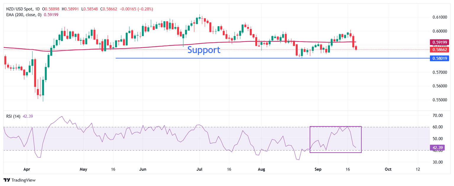 NZD/USD extends its winning streak for the third trading day on Friday. The Kiwi pair stays below the 200-day Exponential Moving Average (EMA), which trades around 0.5920, indicating that the overall trend is bearish.
