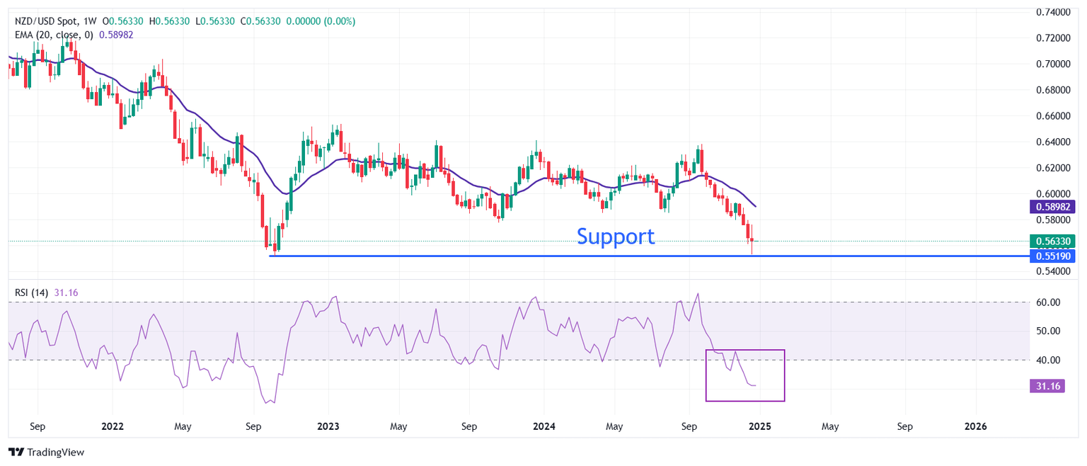 NZD/USD finds a temporary cushion near the two-year low of 0.5520 on a weekly timeframe. The outlook of the Kiwi pair remains bearish as the 20-week Exponential Moving Average (EMA), which trades around 0.5900.