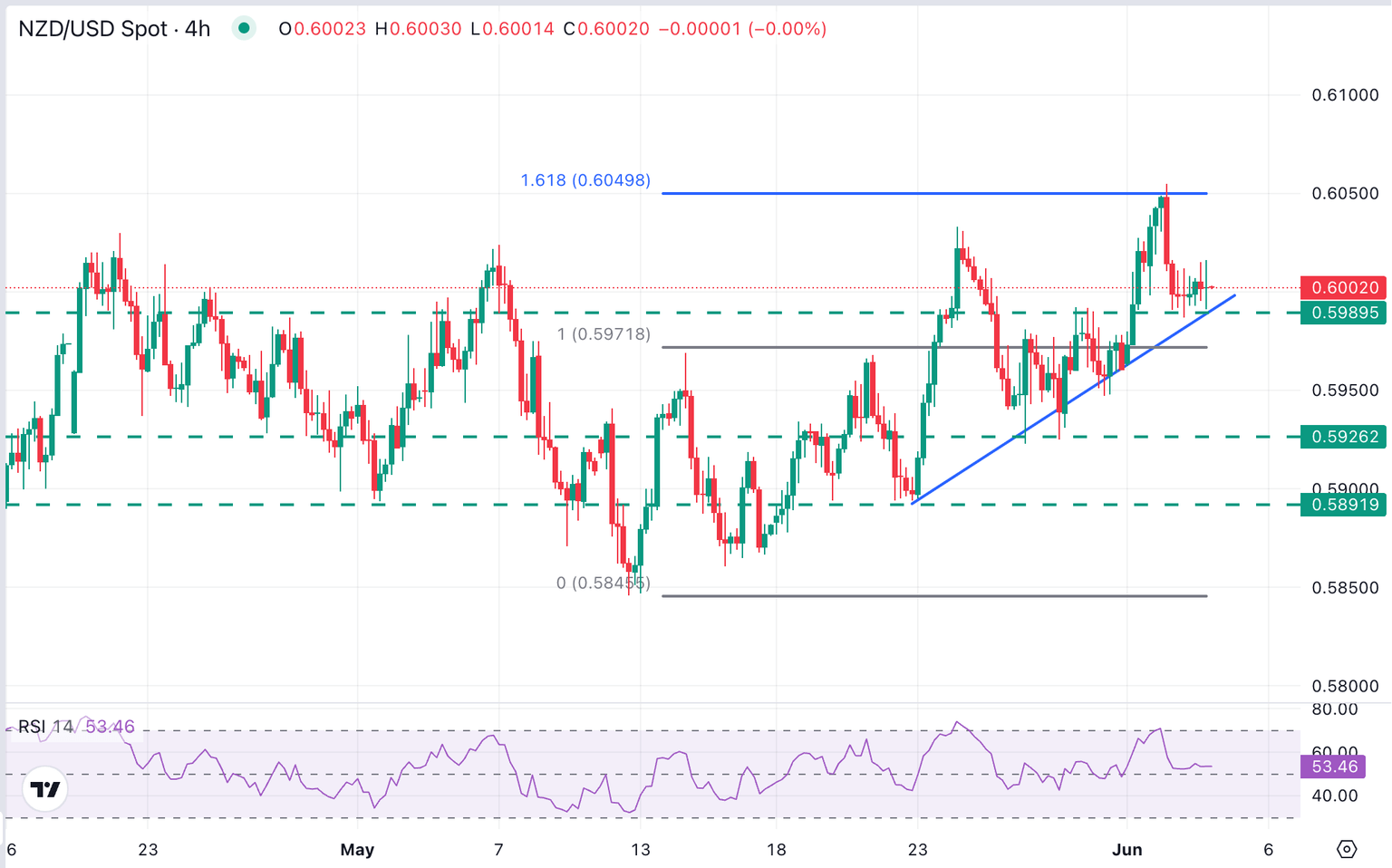The New Zealand Dollar´s correction has been holding above a previous resistance, now turned support at 0.5990, which is also coincident with the ascending trendline resistance from the May 22 lows.