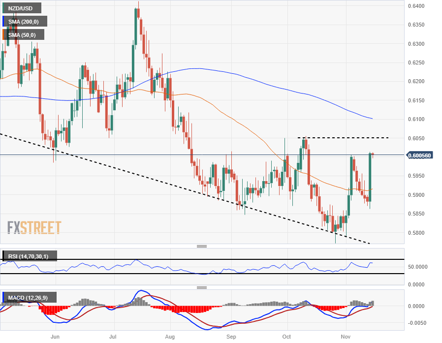 Despite the Kiwi's firm bounce to reclaim the 0.6000 major handle on Tuesday, the NZD/USD remains under significant technical pressure. Price action continues to waffle below the 200-day Simple Moving Average (SMA) currently dropping into 0.6100, and the immediate ceiling on an bullish extension sits at early October's swing high into the 0.6050 level.