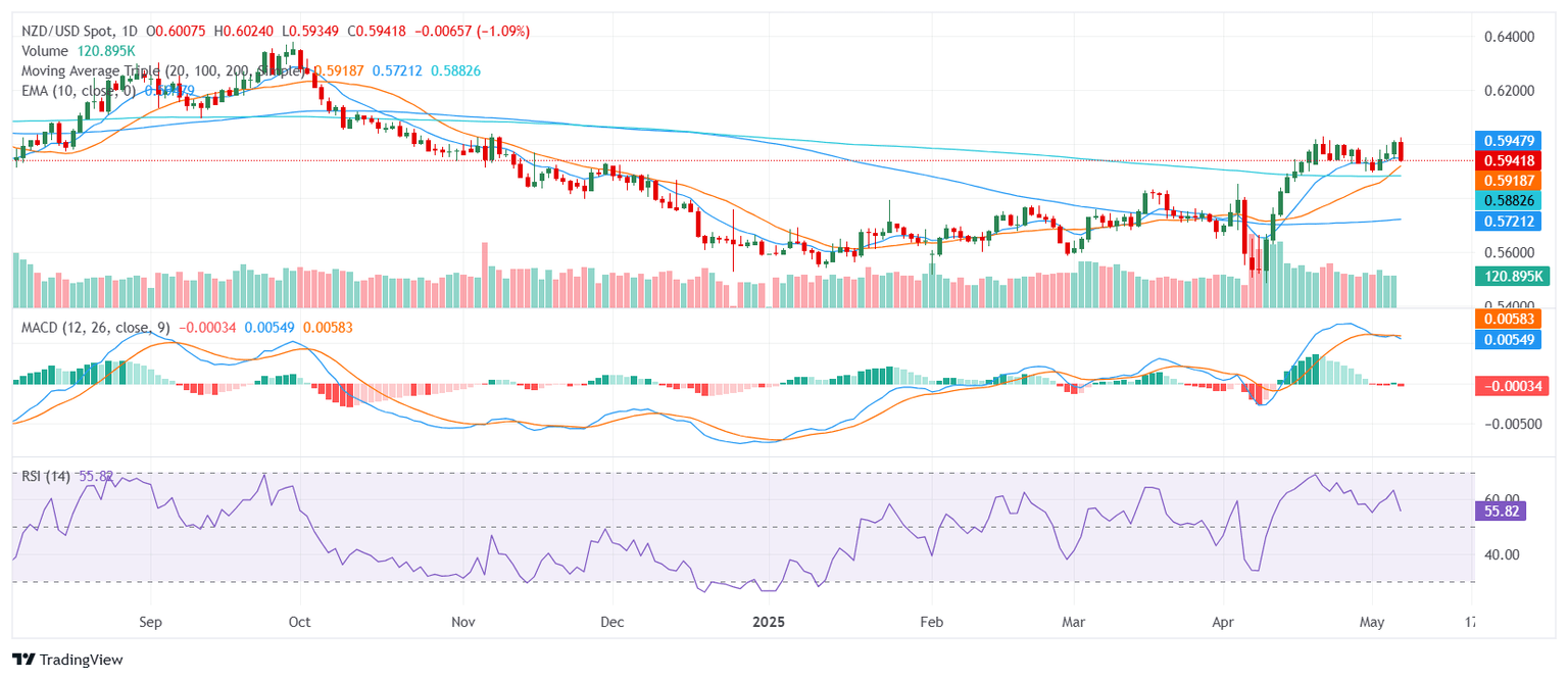 Technically, NZD/USD faces initial resistance at 0.5943, followed by 0.5948 and 0.5952. On the downside, support is seen at 0.5930, 0.5915, and 0.5886. The RSI is neutral at 55.28, while the MACD shows a bearish divergence, suggesting a potential correction. However, longer-term moving averages, including the 100-day SMA (0.5728) and 200-day SMA (0.5886), signal a more bullish outlook, keeping the broader trend intact.