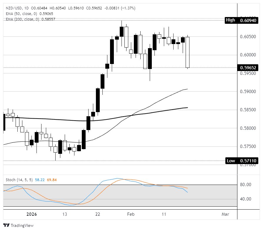 On the daily chart, NZD/USD opened Wednesday near 0.6050 before promptly tumbling 1.35% Through the day. The sell-off produced a large bearish candle that has broken below the 0.6000 psychological level and erased most of two weeks' worth of gains. Despite the drop, price is still holding above the 50-day EMA just north of 0.5900 and well clear of the 200-day EMA near 0.5850, so the broader uptrend from the November low near 0.5580 is still in play. The Stochastic Oscillator has crossed bearish from the upper zone, suggesting momentum has shifted to the downside in the near term. Immediate support rests at the 50-day EMA near 0.5907; a break below would target 0.5850 and the 200-day EMA. Resistance now sits at 0.6000, with the year-to-date high at 0.6094 above.