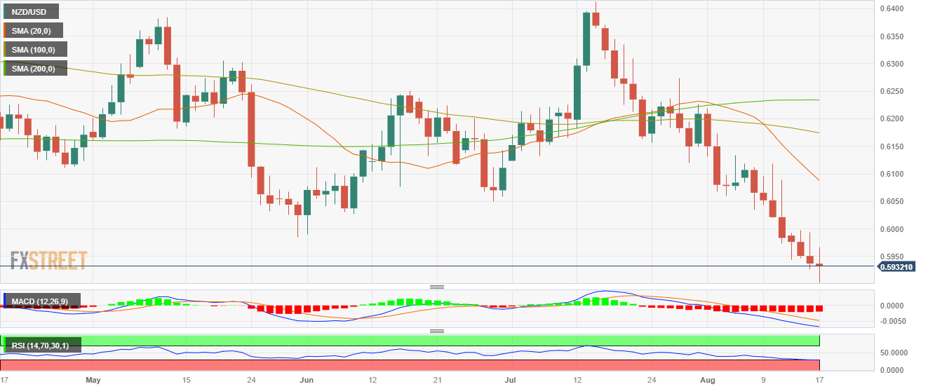 On Thursday, the NZD/USD traded with mild losses near 0.5930. On the one hand, the US reported Jobless Claims data from the second week of August and seemed to get traction on the back of higher US yields after the release of the Federal Open Market Committee (FOMC) minutes from the July meeting. On the other hand, the NZD trades weak against most of its rivals amid the spooky outlook given by the Reserve Bank of New Zealand’s Governor.