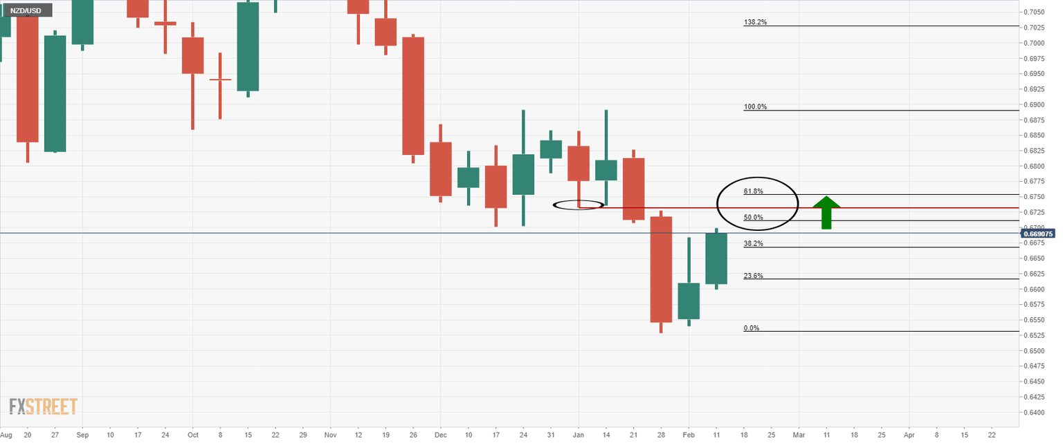 As per the prior analysis, whereby it was noted: ''NZD/USD bulls are taking charge in a significant correction,'' that was moving ''in on old lows near 0.67 the figure and towards the neckline of the M-formation near 0.6733,'' the price reached the target on Thursday. This resided between the 50% mean reversion and the 61.8% ratio as follows: