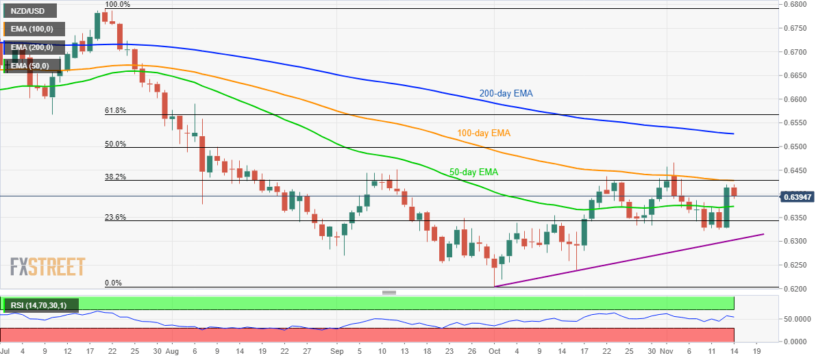 In doing so, a 50-day Exponential Moving Average (EMA) level of 0.6373 acts as immediate support to watch ahead of multiple lows since Friday, around 0.6320, followed by an ascending trend line since October started, around 0.6300.