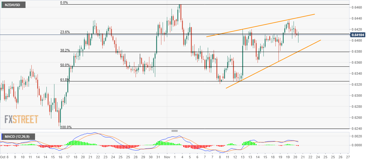 The NZD/USD pair’s declines below 23.6% Fibonacci retracement pushes sellers to look for confirmation of the bearish chart pattern as the quote seesaws near 0.6410 during early Thursday.