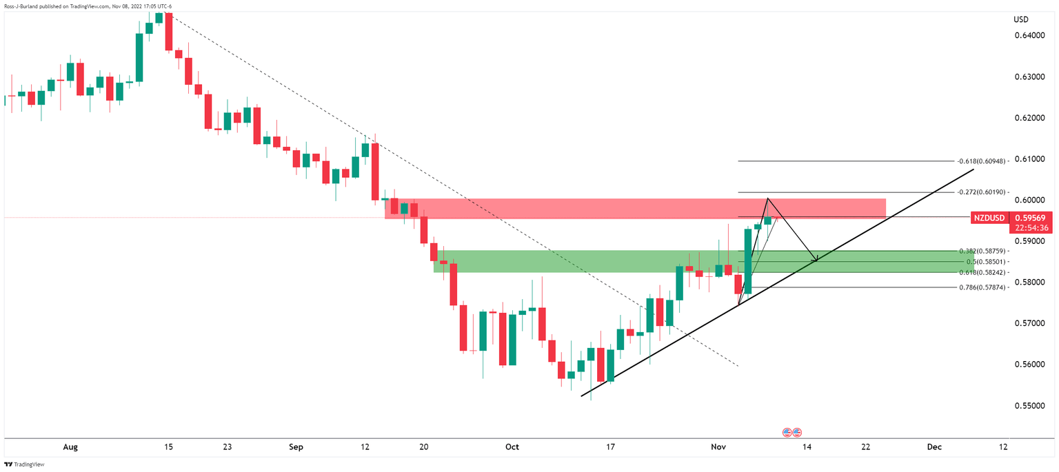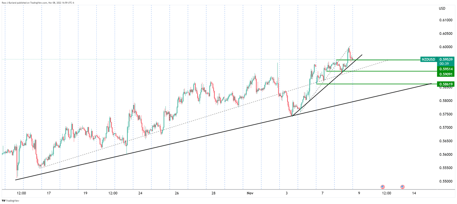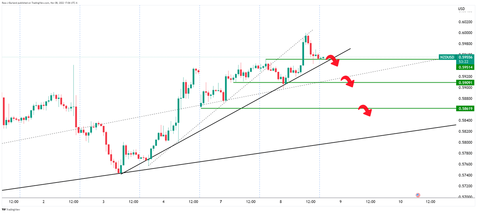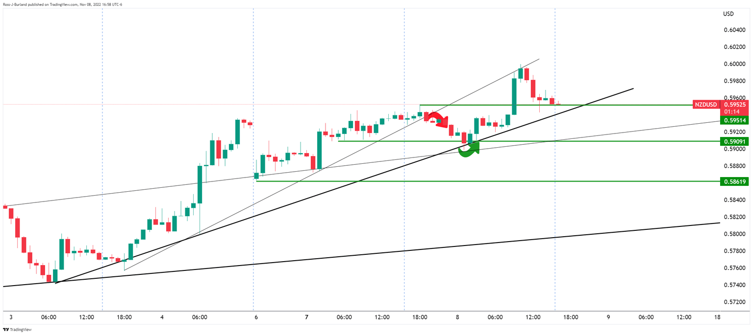 The pair is testing the commitments of the bulls at the next micro trendline. 0.5950 is important in this regard.