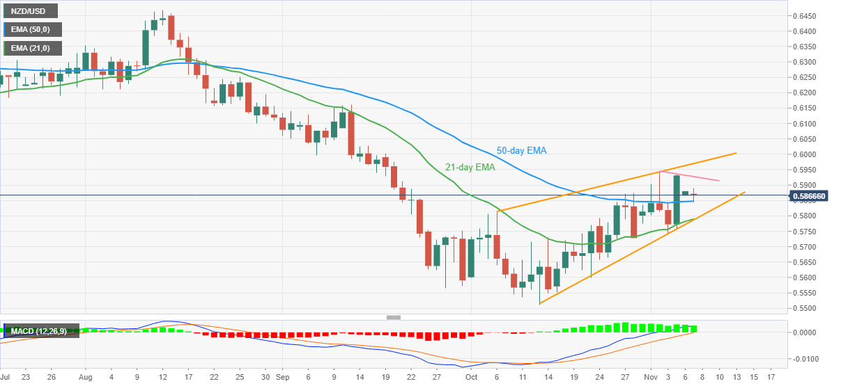 NZDUSD bears attack 50-day EMA support around 0.5850 during the early hours of Monday, after posting the biggest daily jump since October 2011 the previous day. In doing so, the Kiwi pair stays inside a monthly rising wedge bearish chart pattern.