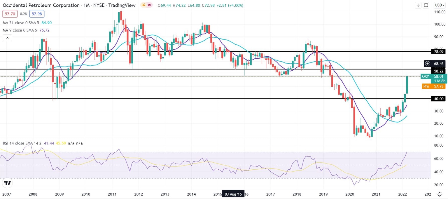 - OXY may be overbought, RSI at 70 on monthly chart.