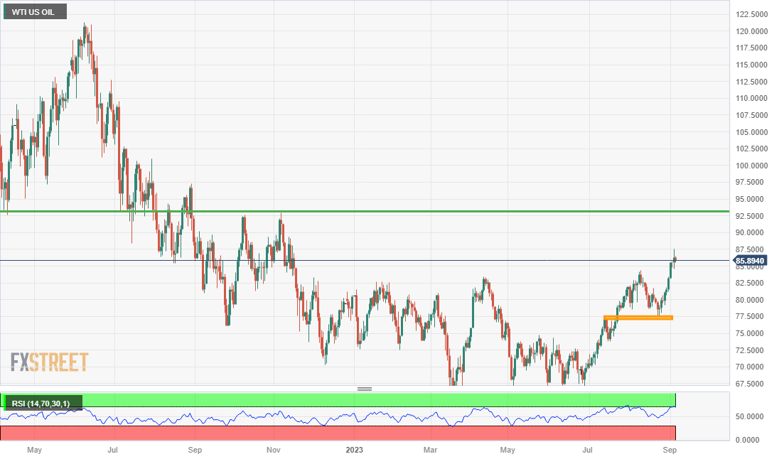 - Oil (WTI) takes a step back after hitting $87.50 on Tuesday.