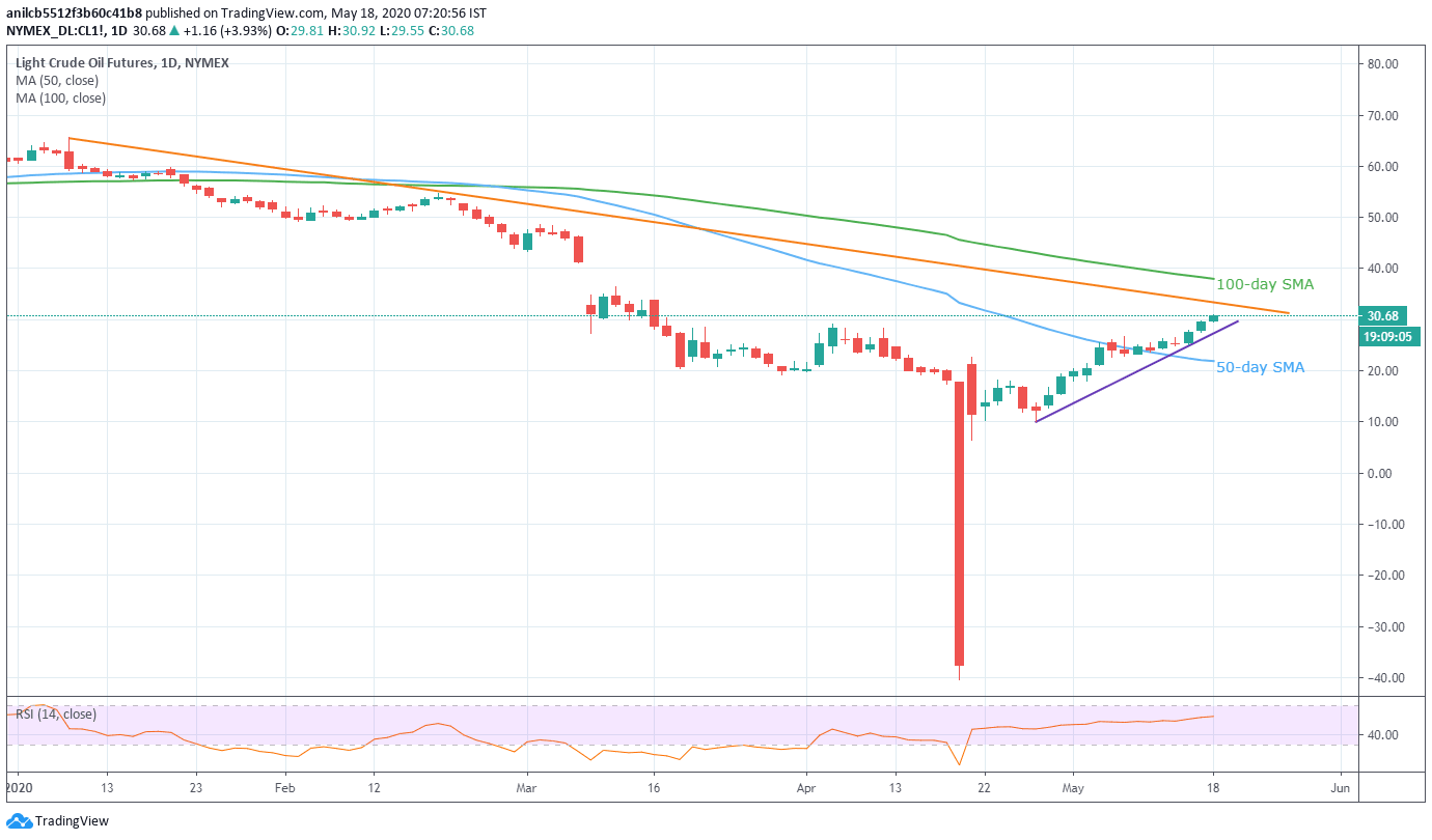 Oil Price Forecast: WTI bulls eye yearly resistance line above $30.00