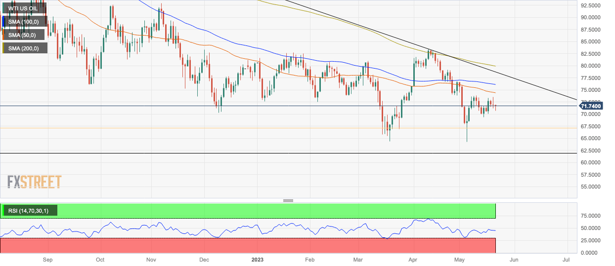 WTI Oil is in a long-term downtrend, making successive lower lows. Given the old adage that the trend is your friend, this favors short positions over long positions. WTI Oil is trading below all the major daily Simple Moving Averages (SMA) and all the weekly SMAs except the 200-week which is at $66.89.