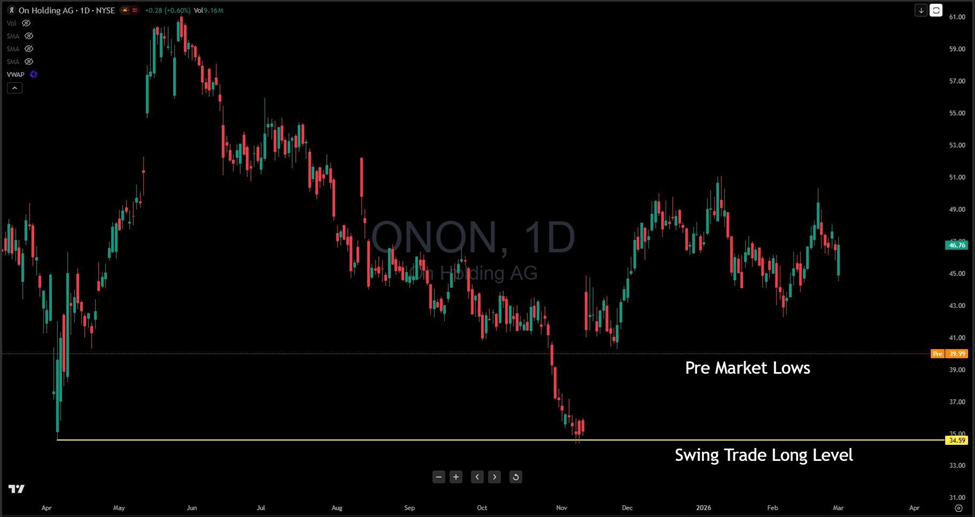 The operational business remains impressive. But impressive businesses can still have difficult charts. Right now, ONON is asking traders to decide whether this morning's drop is an overreaction — or the beginning of something more extended.