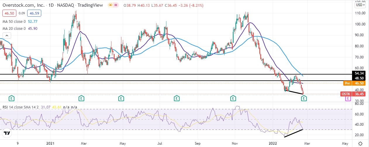 While OSTK shares are rebounding marvelously on the earnings call, shares have been down more than 38% year to date. This means that a one-day rebound is not saying much. On the daily chart OSTK needs to retake $48.50 and $54.34 to make this bull run a long-term phenomenon. $48.50 is support from late 2020 that may turn into resistance. $54.34 is the recent high from February 9. The 50-day and 20-day moving averages are both near these resistance levels and add to their significance.