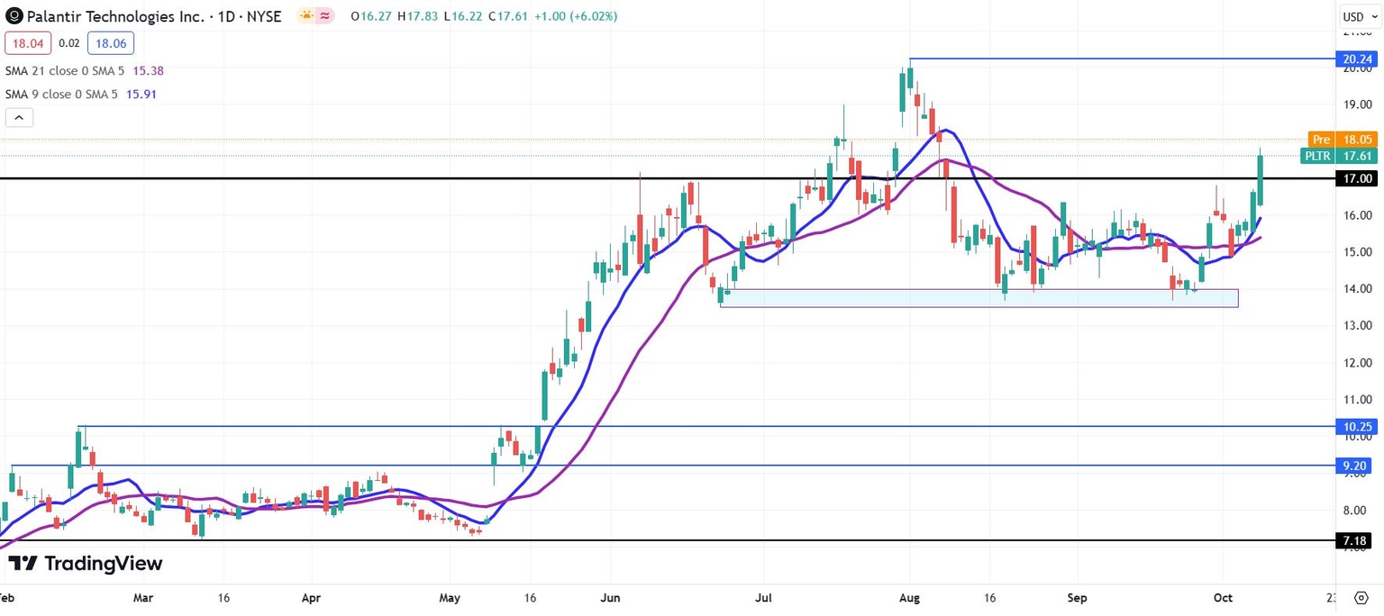 - PLTR stock is back above the $17 level, an important resistance level.