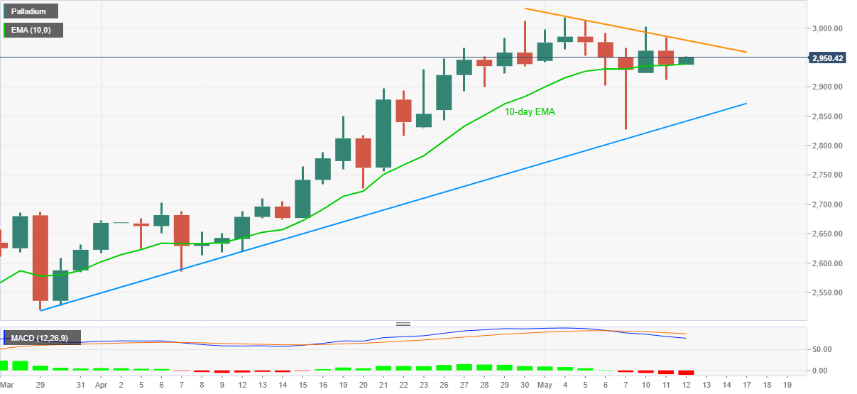 Palladium (XPD/USD) picks up bids around $2,950, up 0.44% intraday, as European traders brace for Wednesday’s trading bell. In doing so, the commodity highlights 10-day EMA as near-term strong support even as the monthly resistance line tests the buyers amid bearish MACD.