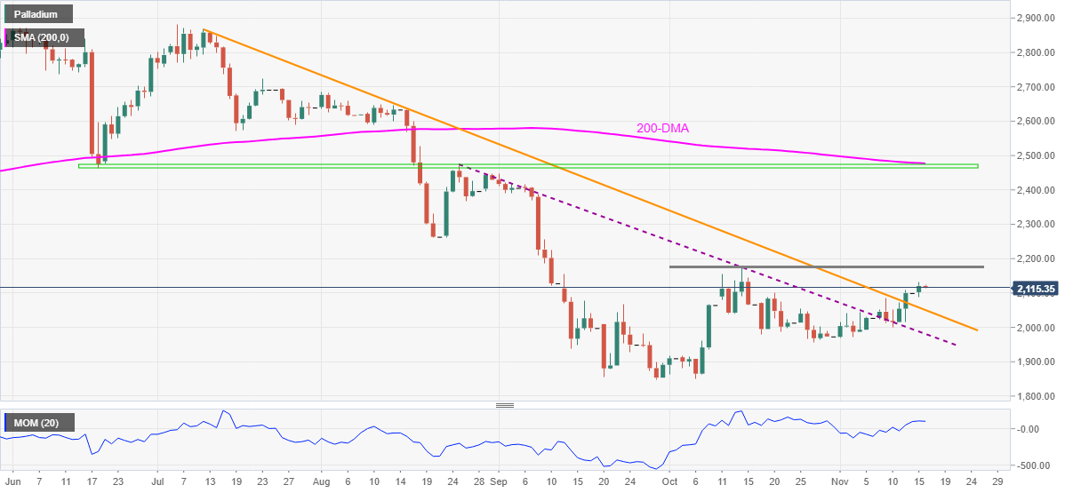 Palladium (XPD/USD) bulls take a breather around a one-month high, recently sidelined near $2,115 ahead of Tuesday’s European session.