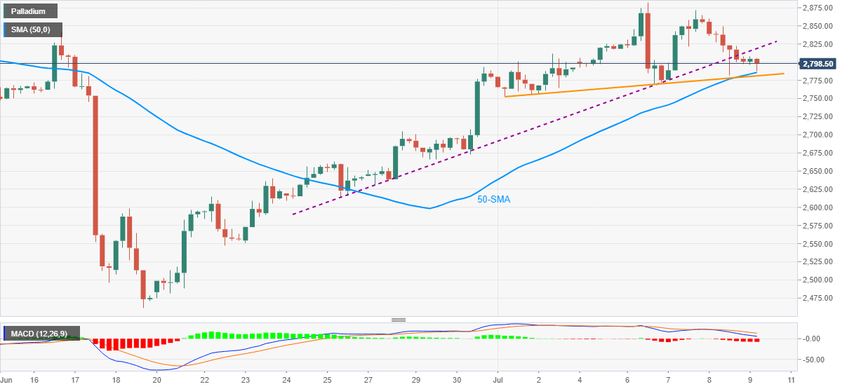 Palladium (XPD/USD) prices trim intraday losses, down 0.30% around $2,799, ahead of Friday’s European session. The precious metal broke a two-week-old support line the previous day but 50-SMA and monthly rising trend line test the sellers of late.