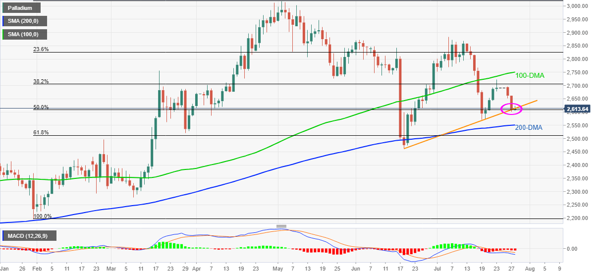 Palladium (XPD/USD) fades early Asian bounce off weekly low, up 0.10% intraday taking rounds to $2,615, ahead of Wednesday’s Asian session.