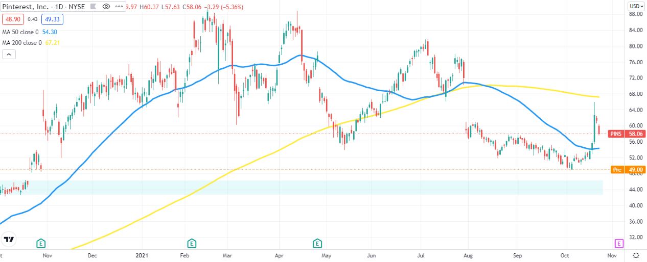 Since there is a clear price gap from that late October 2020 climb, it is almost certain that PINS shares will close that gap to $46.35. The goal at present for PINS bulls will be simply to get back above $54.30 – the 50-day moving average.
