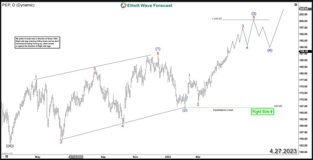 The rally from March 2022 low unfolded as a leading diagonal in wave (1) at $186.84, followed by a pullback in wave (2) ended at $167.05. Ideally, the move higher in wave (3) should target the 100% Fibonacci extension area at $200.53, followed by a potential 3-wave pullback before resuming the rally. Additionally, the 123.6% – 161.8% Fibonacci extension levels, located at $208 – $221, may come into play at a later stage of the cycle. In conclusion, PEP’s Elliott Wave patterns suggest that the stock is in a bullish sequence from March 2022 low, with the wave (3) in progress. Any pullbacks in 3, 7, or 11 swings should be seen as potential buying opportunities, as long as the stock remains supported above the wave (2) low of $167.05.