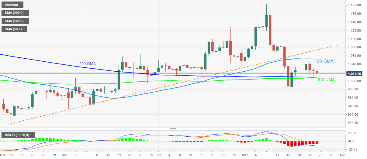 Platinum (XPT/USD) takes offers to refresh intraday low near $1,017, down 0.61% intraday ahead of Thursday’s European session.