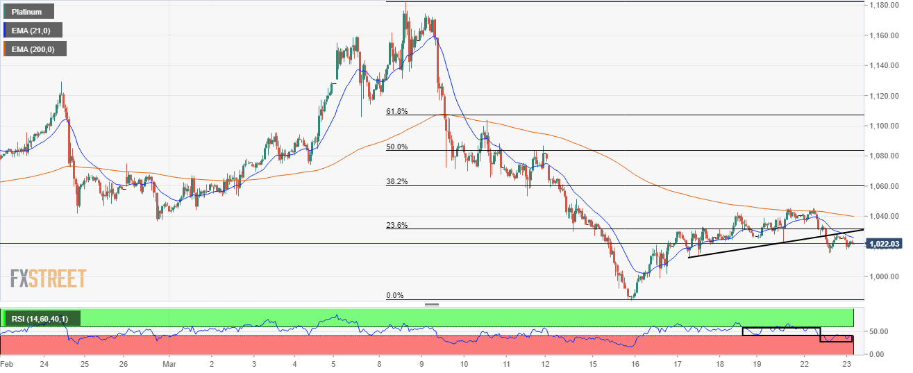 On an hourly scale, Platinum has sensed resistance while overstepping 200-period Exponential Moving Average (EMA), which has dragged the asset lower. The precious metal has failed to sustain above 23.6% Fibonacci retracement (placed from March 8 high at $1,182.49 to last week’s low at $984.35) at $1,031.80. The asset has witnessed some significant offers after violating the trendline on the downside placed from March 17 low at $1,012.45.