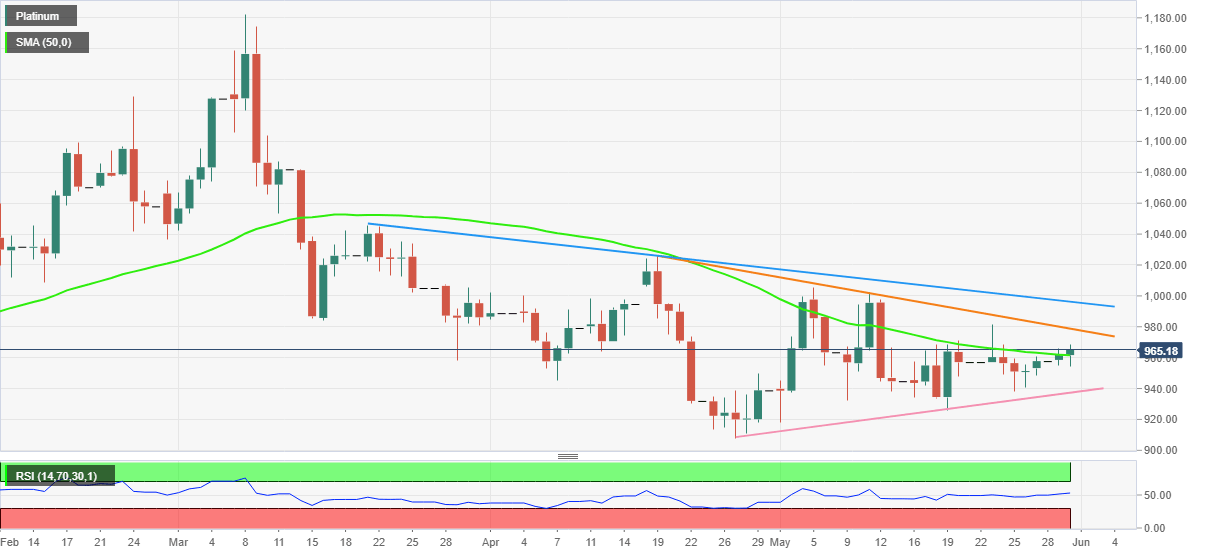 Platinum (XPT/USD) justifies the upside break of the 50-DMA by renewing the weekly top around $968, close to $965 by the press time of early Tuesday morning in Europe.