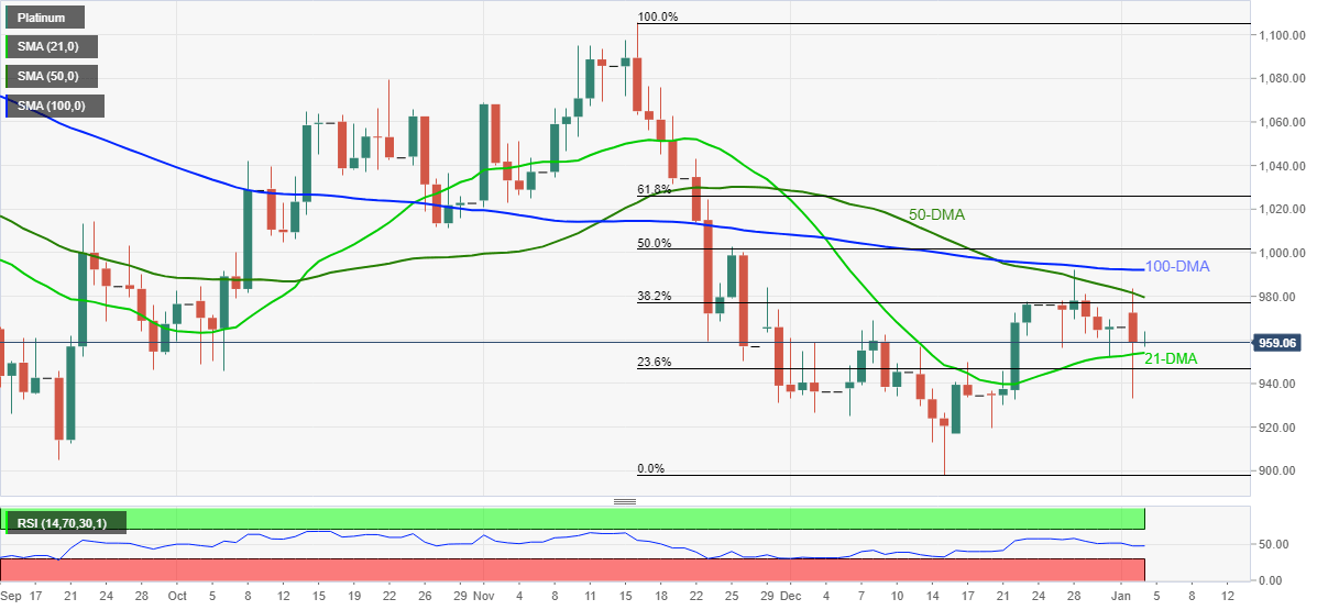 That said, the 21-DMA level near $954 precedes 23.6% Fibonacci retracement of November-December downside, around $947, to restrict short-term declines of the metal.