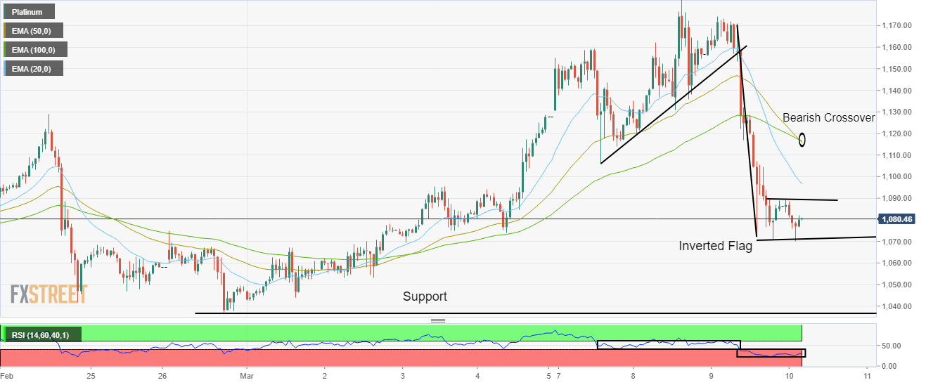 Platinum (XPT/USD) is oscillating in a range of $1,070.04-1,089.85 in the Tokyo session. The bullion has witnessed a firmer plunge after violating the trendline placed from the March 7 low of $1105.90, adjoining the March 8 low at $1,119.76. After skidding below the trendline placed, Platinum has found the ground near $1,070.