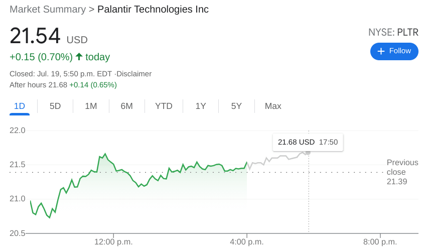 NYSE:PLTR took a turn to start the week on Monday, and reversed its recent bearish trend by showing surprising strength during a broader market sell off. Shares of Palantir added 0.0% to close the trading session at $21.54, as the stock was a lone spot of green amongst an overwhelming sea of red. The markets tumbled right after the opening bell as fears of rising COVID-19 delta variant cases instilled fear on Wall Street. As investors look ahead to potential restrictions being imposed again, blue-chip and cyclical reopening stocks were hammered, while growth and stay at home stocks accounted for most of the green on Monday.