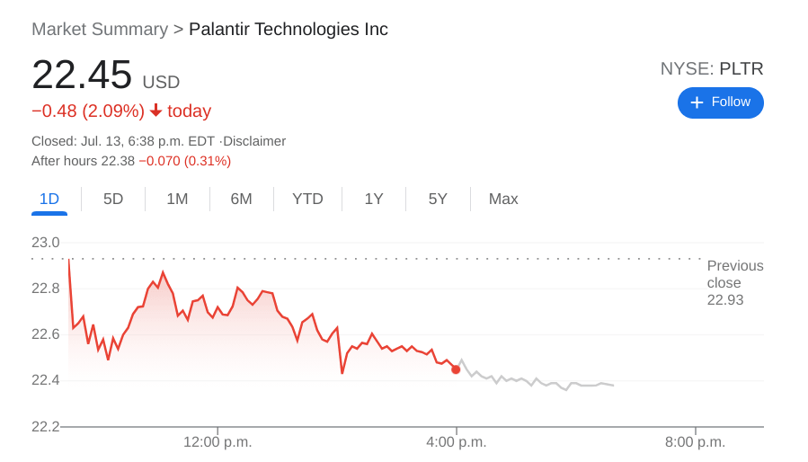 One positive that Palantir bulls are identifying on the charts is that the stock seems to be forming a descending wedge pattern, which is usually a bullish indicator that the trend is about to breakout in the opposite direction. Palantir has been falling as of late, but has seen a trend of making higher lows. Tuesday’s decline may be more indicative of the broader markets showing weakness after rising inflation rates from higher than expected June CPI figures. After these premarket announcements, all of the major indices trended down throughout the day, as these macroeconomic events can drag all stocks down together.
