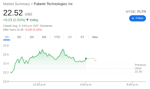 NYSE:PLTR has finally strung together some back to back green days, as the stock begins to build some momentum ahead of its earnings call on August 11th. On Thursday, shares of Palantir added 0.99% and closed the trading session at $22.52. Palantir managed to outpace the broader markets but not by much, as the S&P 500 hit a fresh new all-time high and the NASDAQ hit a 52-week high at the close. The markets were surprisingly bullish ahead of Friday’s key July jobs report, which could have a direct impact on the Federal Reserve’s monetary policy tightening in the coming quarters.