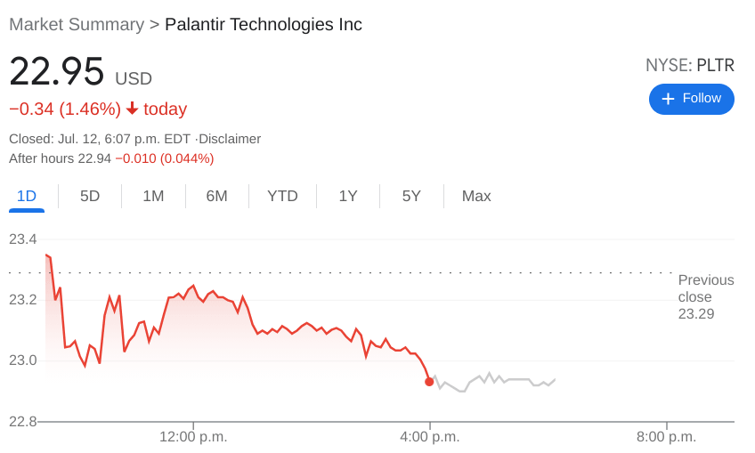 - NYSE:PLTR fell by 1.46% on Monday, as growth stocks struggled to gain any traction.