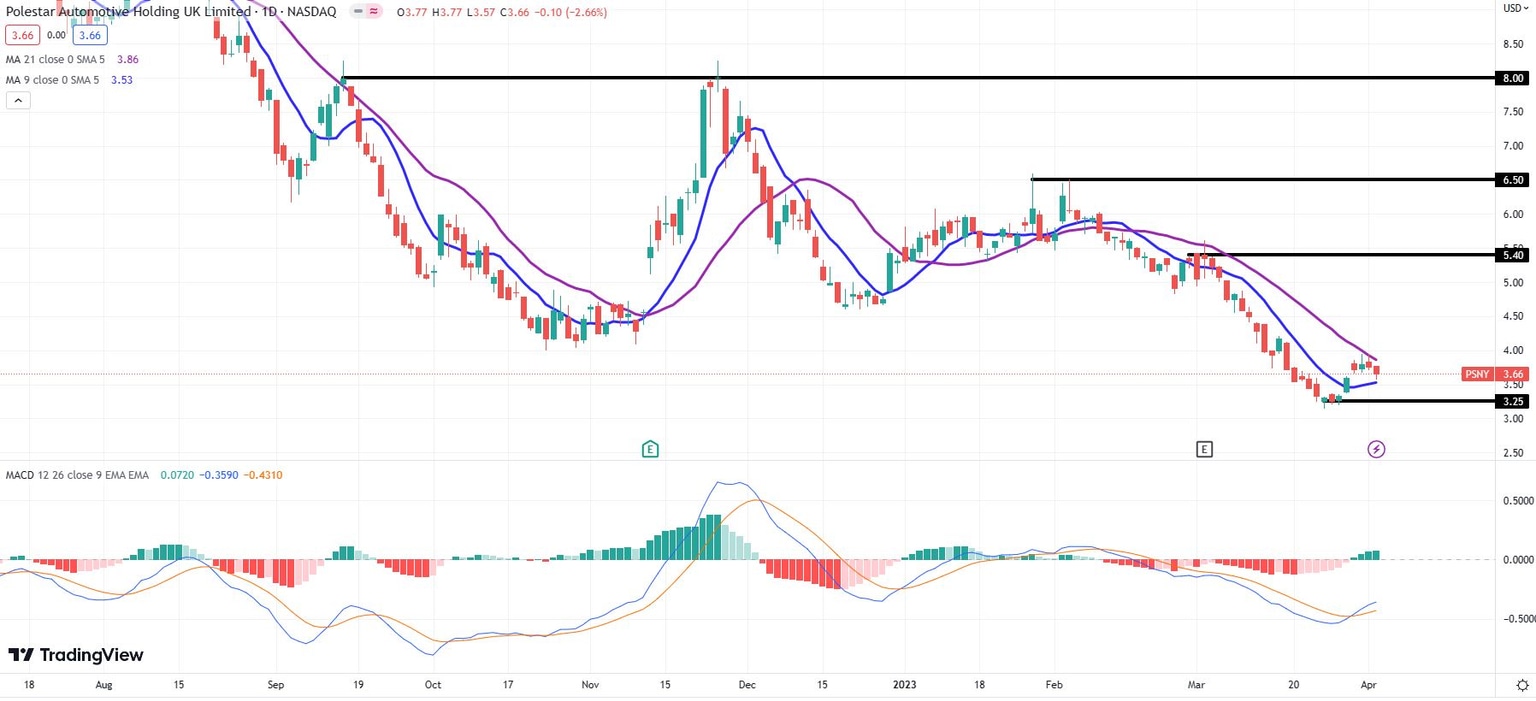 As you can see at the bottom of the daily chart below, Polestar stock has witnessed a bullish crossover on the MACD. This typically foreshadows a rally of some sort. Additionally, the RSI (not shown) spent the last half of March in oversold territory. After emerging back into neutral in April, this augurs well for the month ahead. Of course the macro environment may have a different feeling, but PSNY has not been a staunch follower of broad market dynamics thus far.