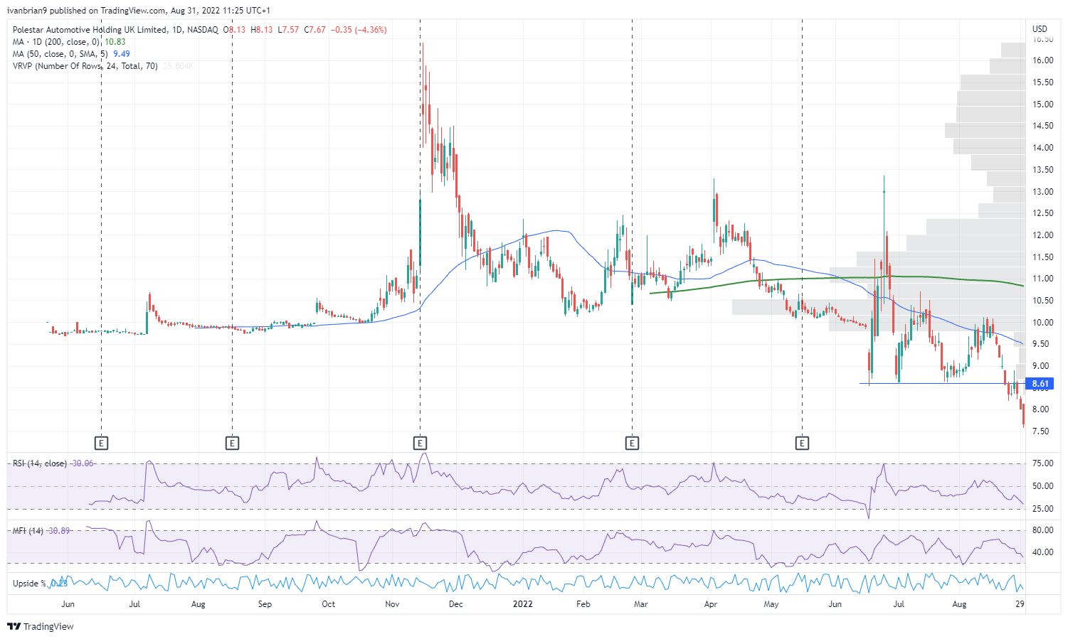 $10 was a key support for the old GGPI as SPAC companies have to hold $10 in cash to return to shareholders if they fail to merge with an intended target. That requirement is now gone once the deal with Polestar goes through, so $10 is now long gone as support. With such a lack of history, there is little in the way of technical analysis to perform here. The one interesting feature to watch for is oversold readings on the Money Flow Index (MFI) and the Relative Strength Index (RSI). Both are declining but are yet to reach oversold zones. News flow is what will move this stock, and we are unlikely to get that until October.