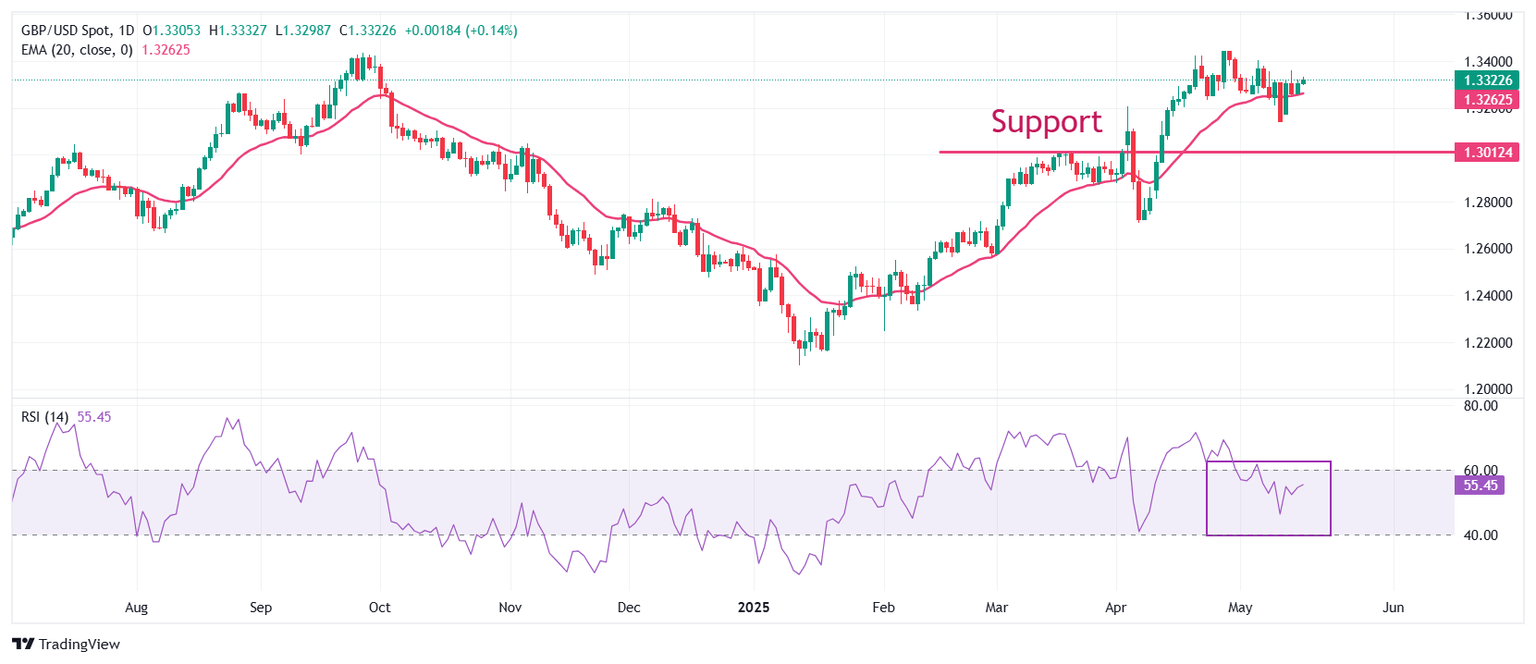 The Pound Sterling faces pressure above 1.3300 against the US Dollar on Friday. Still, the GBP/USD pair holds above the 20-day Exponential Moving Average (EMA), which trades around 1.3256, suggesting that the near-term trend is bullish.