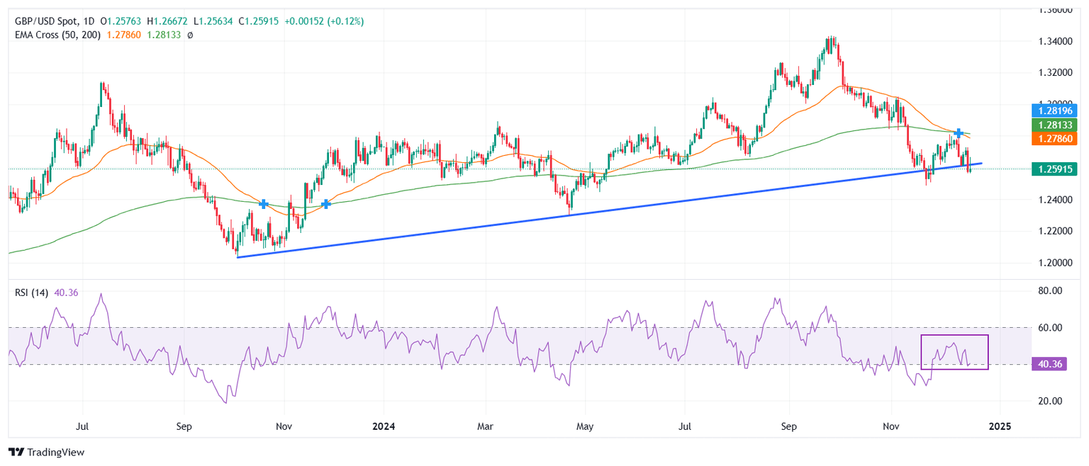 The Pound Sterling trades above a fresh three-week low near 1.2555 against the US Dollar on Thursday. The GBP/USD pair struggles to hold the upward-sloping trendline, which is plotted from October 2023 low around 1.2035, and remains a key support zone below 1.2600.