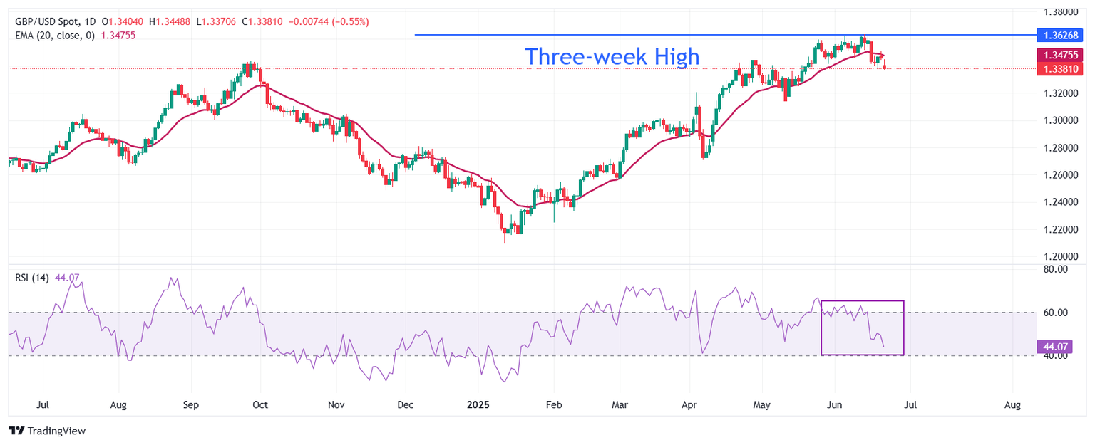The Pound Sterling falls below 1.3400 against the US Dollar on Monday. The near-term trend of the GBP/USD pair remains bearish as it stays below the 20-day Exponential Moving Average (EMA), which is at around 1.3477.